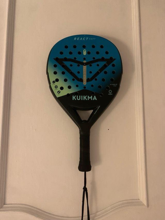 Raqueta de pádel Kuikma React Soft. - Diseño en color azul y verde. - Superficie con agujeros. - Mango negro. - Incluye cordón de seguridad.