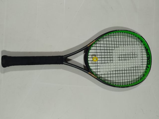 Raqueta de tenis Prince Tour 100P. - Marco negro con detalles verdes. - Cuerdas blancas. - Empuñadura negra.