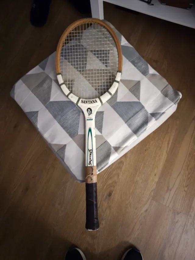 Detalles del productoRaqueta de tenis clásica de la marca Santana, modelo Spalding.