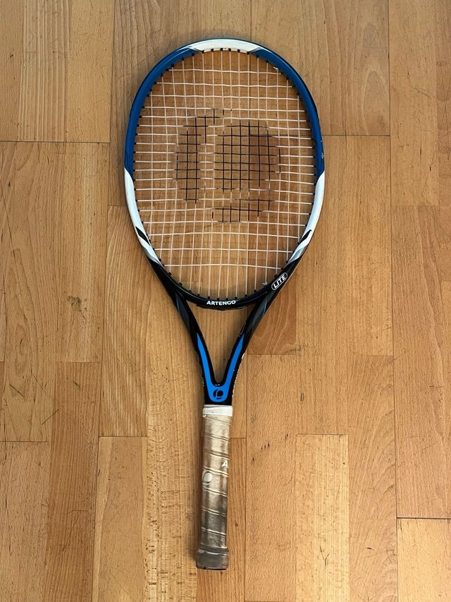 Detalles del productoRaqueta de tenis Artengo en colores azul, blanco y negro. Diseñada para un buen agarre y control.