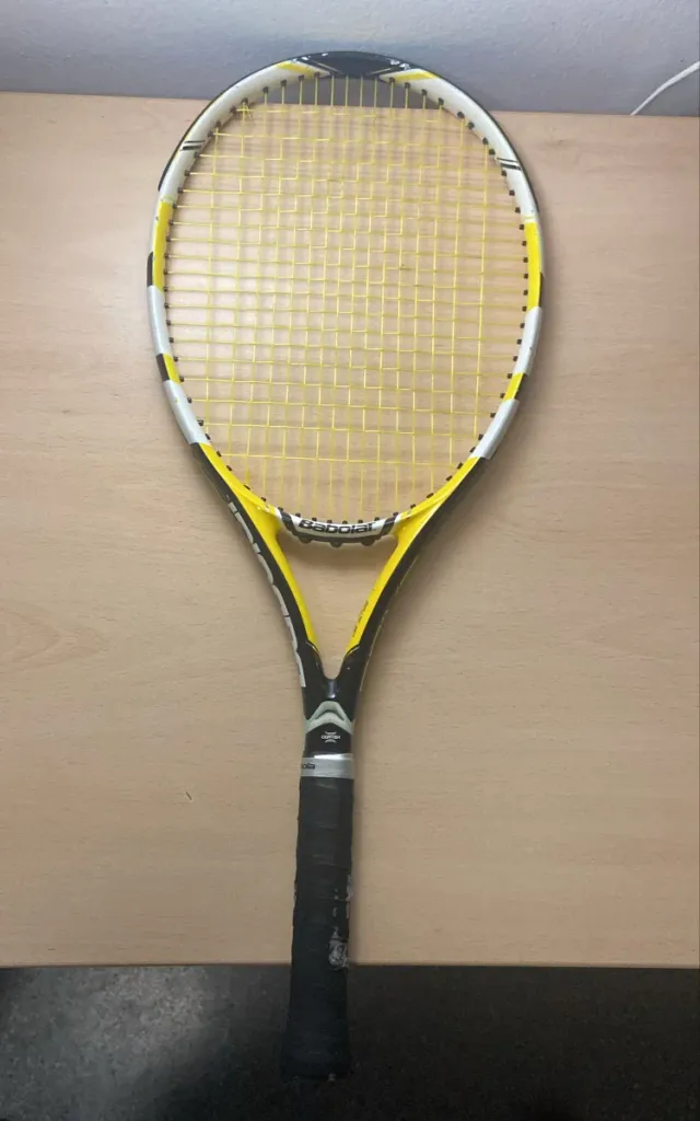 Raqueta de tenis Babolat Drive en color amarillo y blanco. - Marco con detalles en negro. - Cuerdas de color amarillo. - Grip negro.