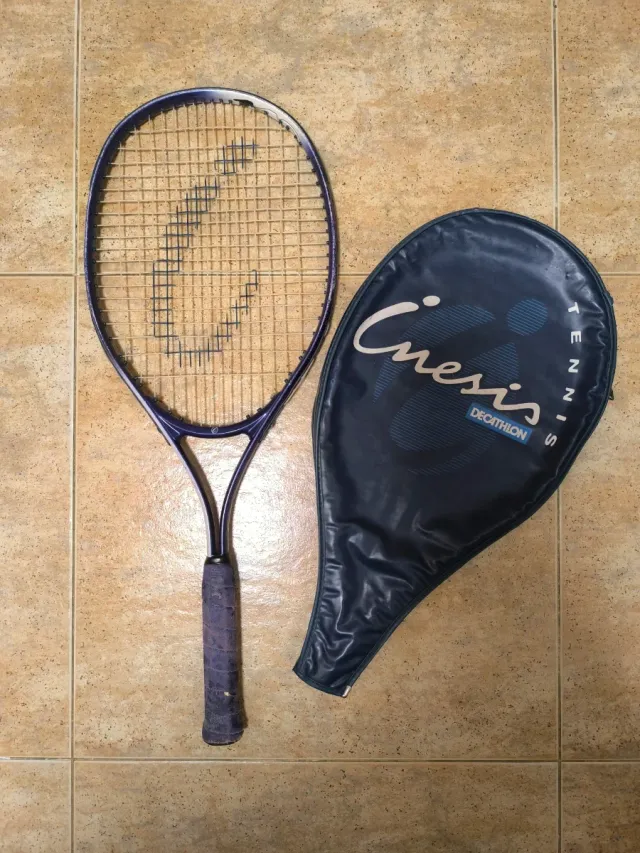 Raqueta de tenis vintage modelo júnior de la marca Cnesis, comprada en Decathlon. Incluye funda. - Raqueta de tenis Cnesis. - Funda para raqueta.