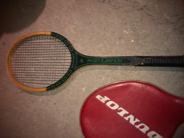 Raqueta de tenis Dunlop modelo Rod Laver. - Marco de madera con detalles en verde. - Cuerdas negras. - Empuñadura negra.