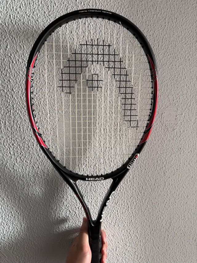 Raqueta de tenis Head Nano Titanium. - Marco negro con detalles en rojo. - Cuerdas blancas. - Logo de Head en el marco.