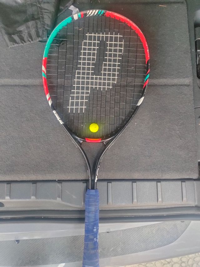 Raqueta de tenis Prince, en prefecto estado. Incluye curioso antivibrador forma de pelota de tenis.