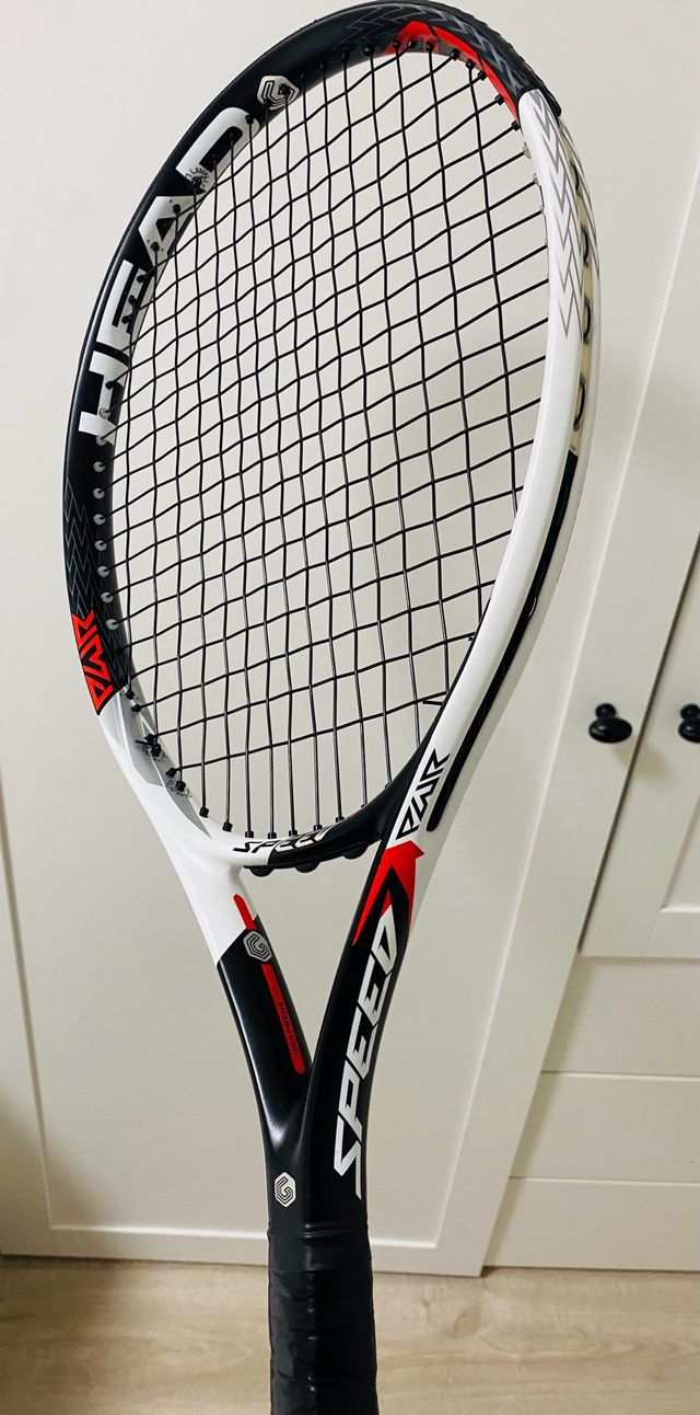Raqueta de tenis profesional HEAD Speed. - Diseño en blanco, negro y rojo. - Cordaje negro. - Mango con grip negro.