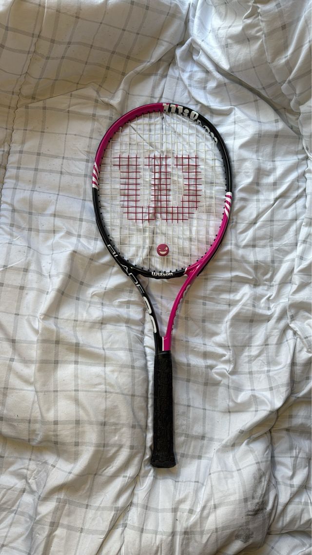 Detalles del productoVendo raqueta de tenis Wilson en estupendas condiciones y dos palas de ping pong. La raqueta tiene un diseño atractivo en tonos rosas y negros.
