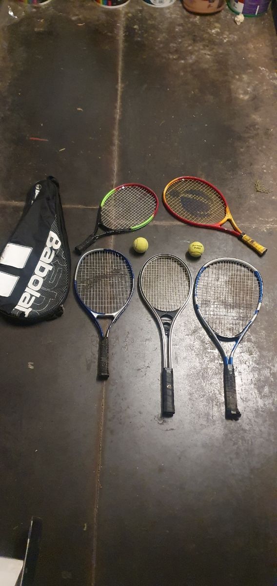 Todo!! 5 Raquetas encordadas. Para iniciacion 3 de pequeñas y 2 grandes y 4 pelotas.