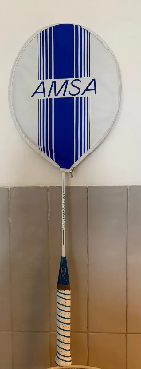 Se venden raquetas de bádminton AMSA. - Diseño con franjas azules y blancas. - Funda protectora con logo AMSA. - Empuñadura con cinta blanca y azul.