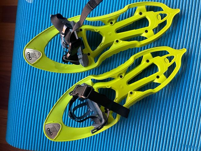Detalles del productoRaquetas de nieve de color verde lima, diseñadas para niños. Son ligeras y fáciles de ajustar.