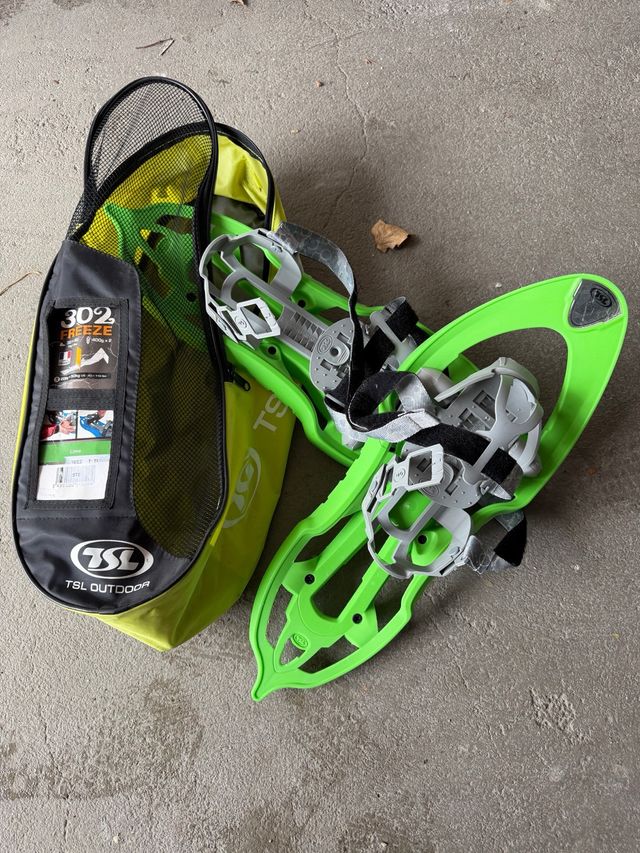 Raquetas de nieve TSL Outdoor en color verde brillante, perfectas para tus aventuras invernales. Incluyen bolsa de transporte.