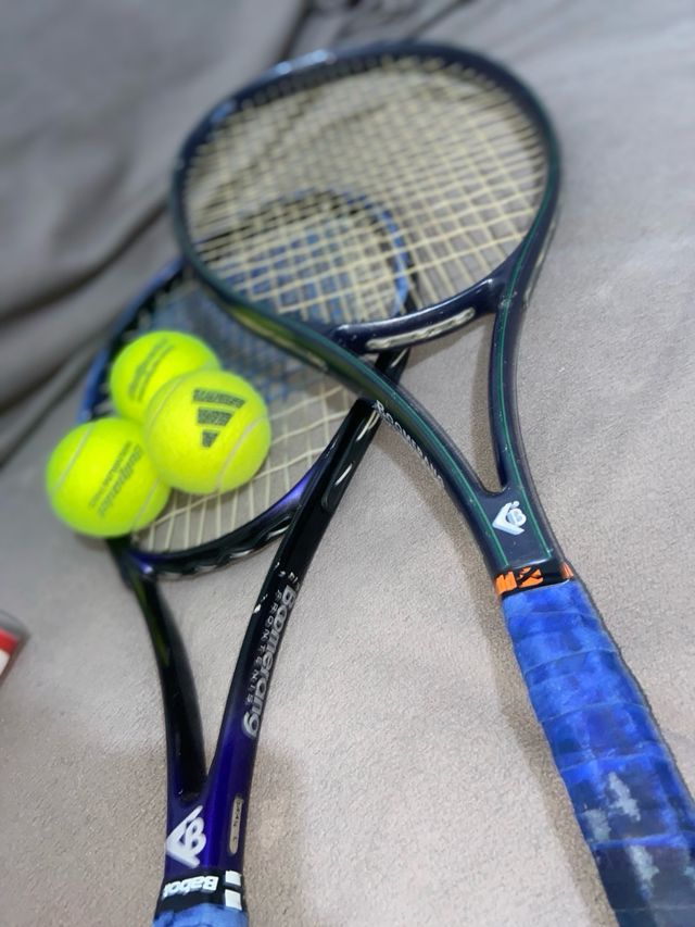 Detalles del productoConjunto de dos raquetas de tenis, una marca Babolat y otra Dunlop, junto con tres pelotas.