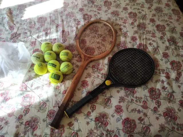 Lote de dos raquetas de tenis y varias pelotas. - Una raqueta de madera. - Una raqueta negra. - Pelotas de tenis amarillas.