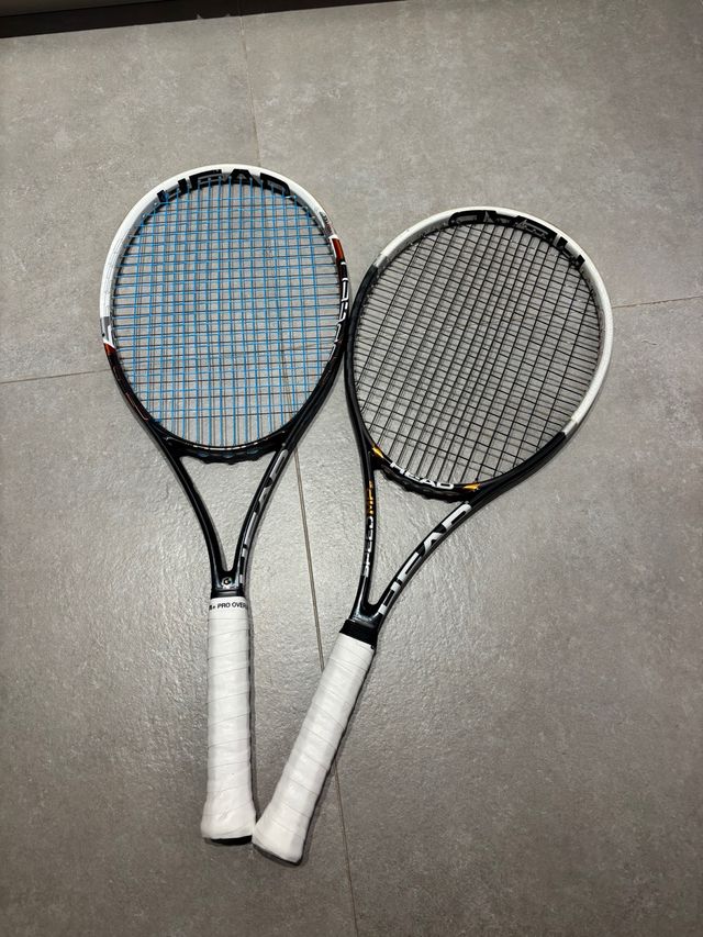 Dos raquetas de tenis HEAD Speed en buen estado. - Diseño moderno y deportivo. - Empuñaduras blancas. - Cuerdas azules en una raqueta y negras en la otra.