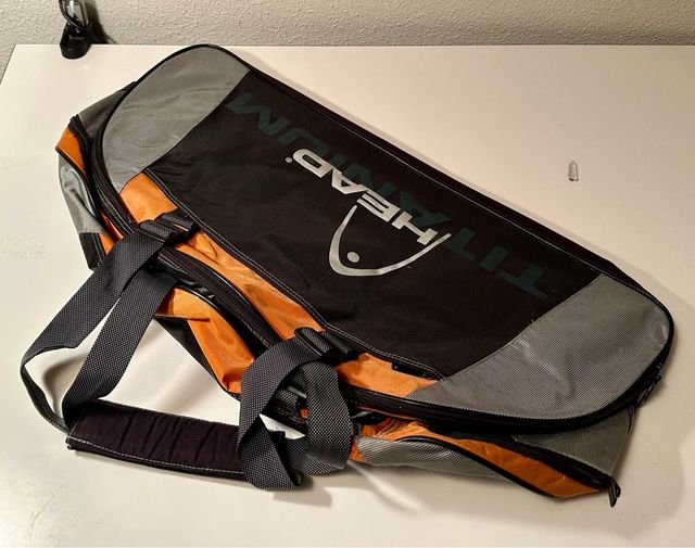 Raquetero con capacidad para dos raquetas y compartimentos para ropa y zapatillas.