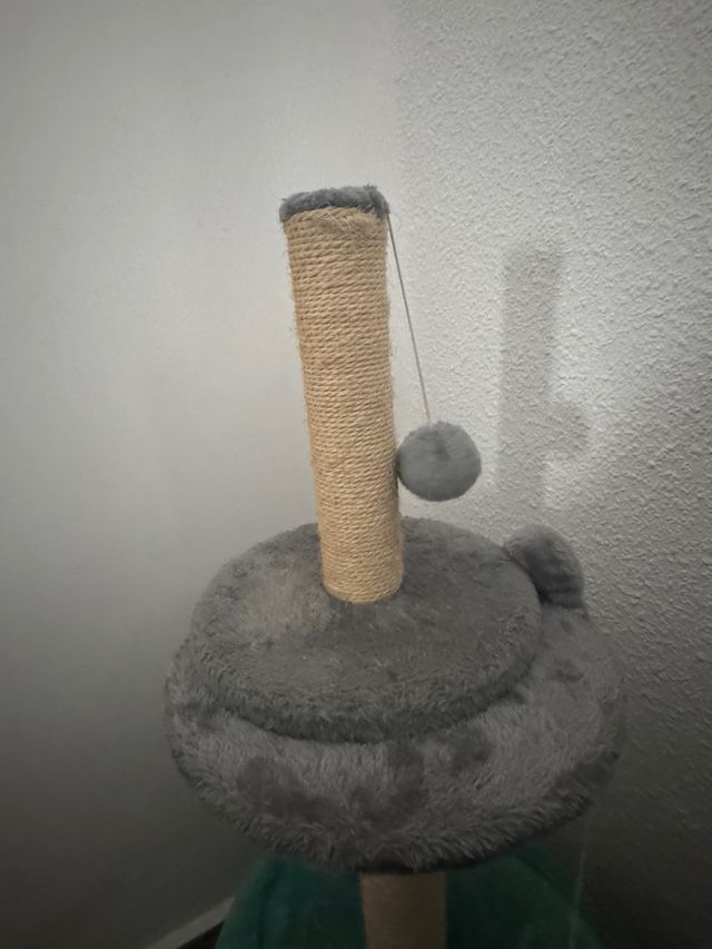 Rascador compacto para gatos, perfecto para espacios pequeños. - Altura de 30cm. - Base redonda y mullida. - Incluye bola colgante para jugar.