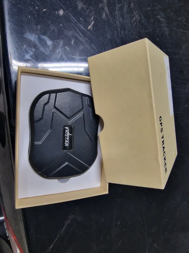 Rastreador GPS Tinstar en su caja original. - Diseño compacto y moderno. - Incluye caja. - Etiqueta GPS TRACKER visible en la caja.
