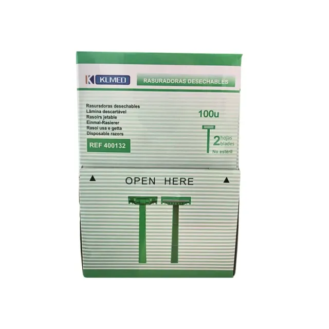 Caja de rasuradoras desechables marca KLMED. - Contiene 100 unidades. - Cada rasuradora tiene 2 hojas. - Color verde. - Modelo: REF 400132. - No estéril.