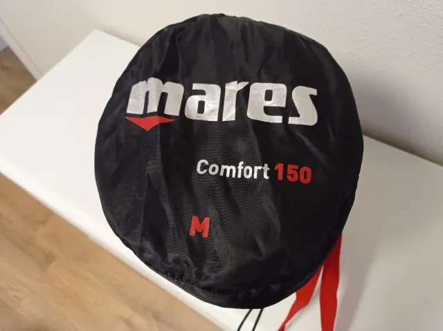 Rata de buceo Mares en talla M. Comprada pequeña y casi sin usar. - Color negro. - Logo de la marca Mares en blanco y rojo. - Detalle Comfort 150 en rojo. - Talla M en rojo.