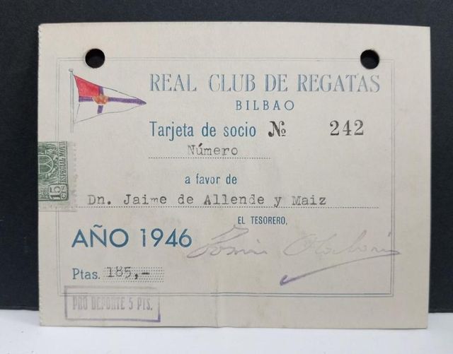 REAL CLUB DE REGATAS BILBAO – TARJETA DE SOCIO. AÑO 1946. SELLOS DE ÉPOCA Y FIRMA ORIGINAL TESORERO.
