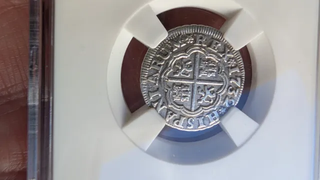 Moneda de plata de 1732, un real. - Diseño detallado con escudo. - Canto con inscripciones.