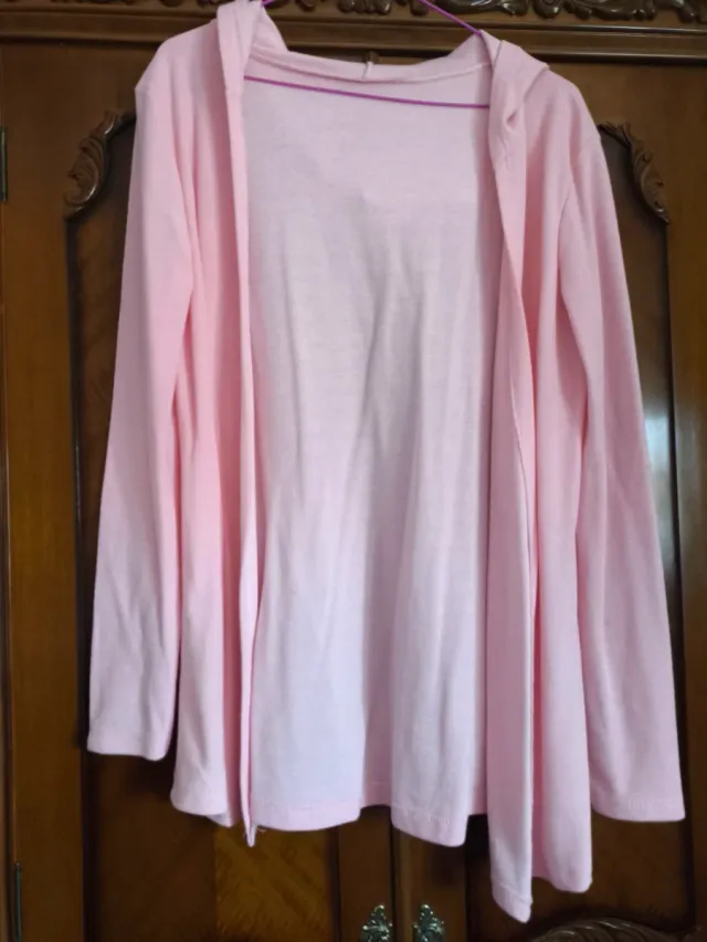 Rebeca de punto fino en color rosa, con un diseño abierto y capucha.