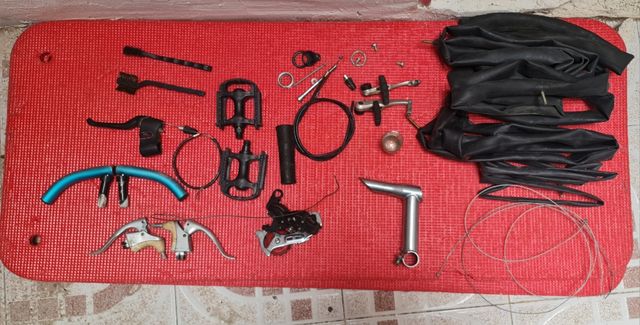 Detalles del productoIncluye varias piezas de recambio bicicleta para reparaciones o mantenimiento. frenos, pedales xerama, manetas, olimpic, manillares, 5 cámaras de aire: tioga 26 pulgadas 26",38", 26x2.00 x1.75 x1.90, x1.95, x 2.10, x 2.25, airstop, tioga, tioca, michelín 28,Cheng shin tube,airstop, cables de freno,puño negro, puños negros, piezas antiguas,antiguo, potenciador,desviador de marchas, shimano tourney,michelin.Shimano 70gs, # cierre taller mecánico,freno,camara, manillar,reparacion pedal,paseo,roldanas, antigua,cambios,montaña, cambio, cambia, ruedas,sillin,retro,vintage,carretera, ciclista, ciclistas,accesorios,bicis,bicicleta,barato