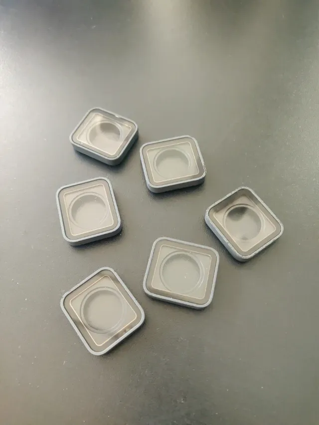 Conjunto de recambios para cámaras GoPro. Piezas de repuesto para tu equipo. - Diseño cuadrado con borde gris. - Lente transparente 5€ unidad Tapas 5€ unidad