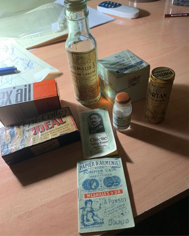 Año 1916, 1914, 1918 documentos / envases antiguos de medicina.se vende por lote (el libro por 15 euros )