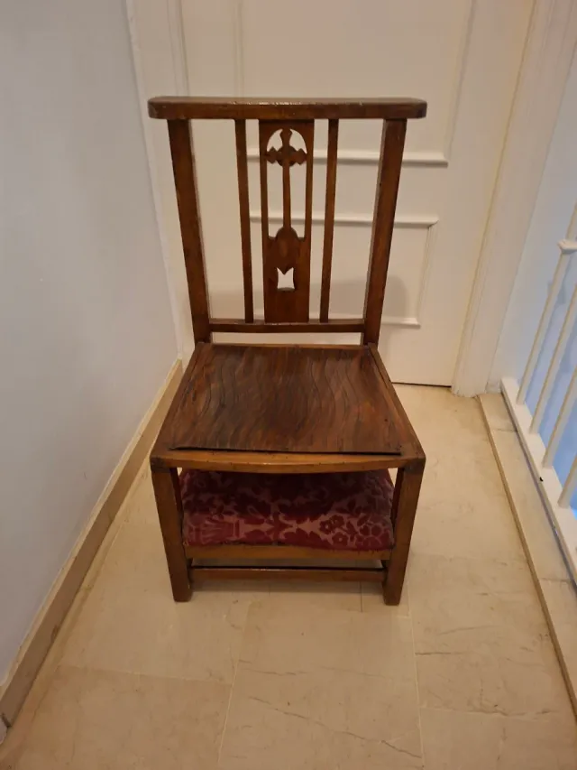 Reclinatorio de madera con un diseño clásico y un cojín para mayor comodidad. - Estructura de madera oscura. - Cojín con estampado floral en tonos rojos.
