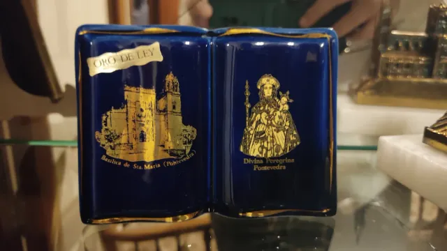 Bonito recuerdo de Pontevedra con detalles dorados. - Representación de la Basílica de Santa María. - Imagen de la Divina Peregrina. - Inscripción Oro de Ley.