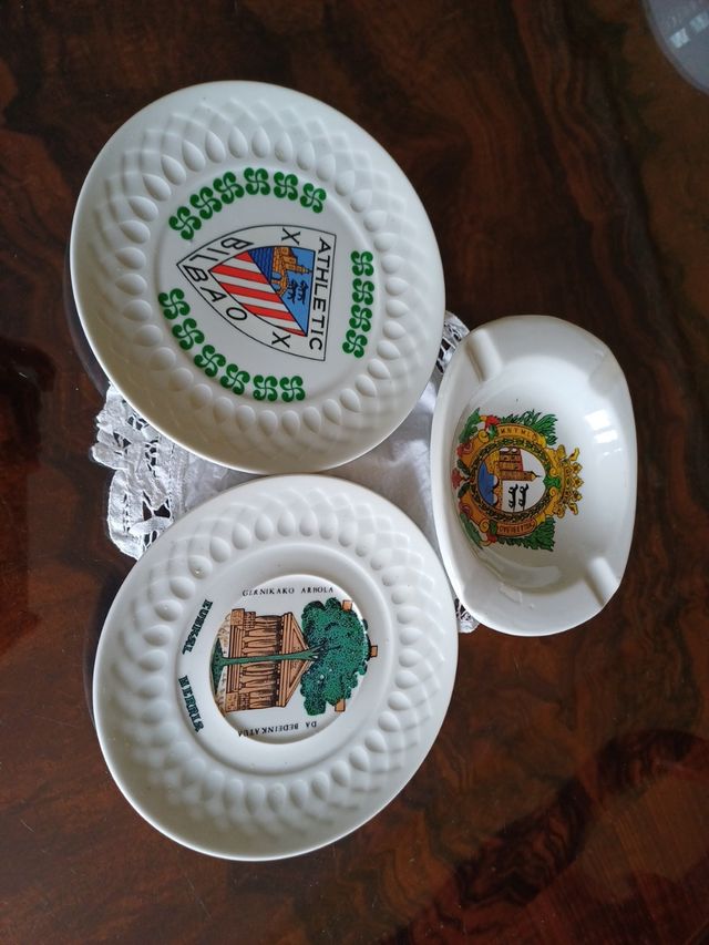 platillos y cenicero de porcelana recuerdo de Bilbao.Precio por unidad.ver mi perfil