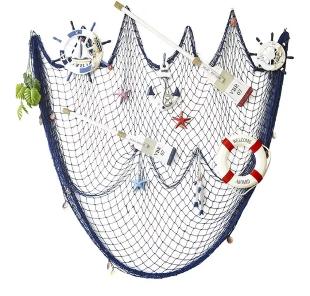 2x4 metros Preciosa red decorativa de estilo náutico, perfecta para añadir un toque marinero a tu hogar - Red de pesca azul. - Adornada con conchas marinas.