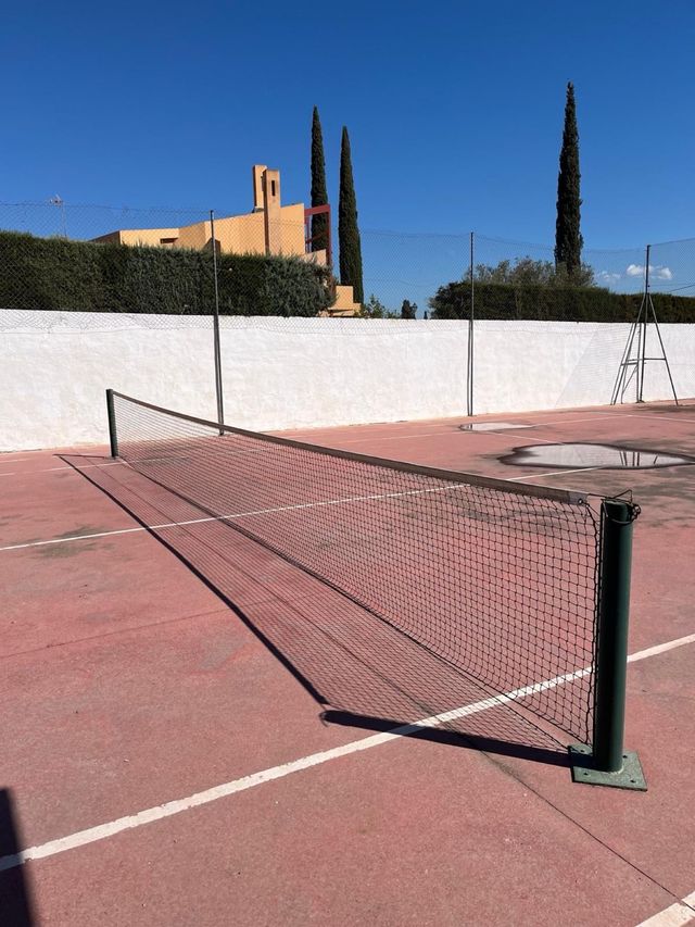 Red de tenis con postes para cancha. - Medidas red 9,20 m. - Medidas Postes: 105 cm - Incluye postes de soporte.