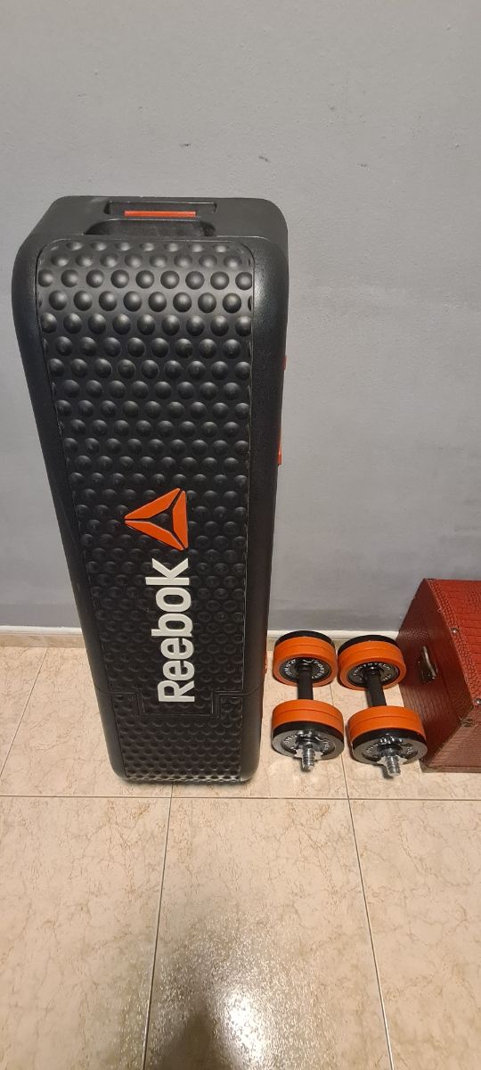 Detalles del productoBanco Reebok step casi nuevo, ideal para hacer ejercicio en casa. Se incluye también dos pesas de 17,5kg cada una, y otros discos de 1,5kg, barra adaptador, bandas elasticas, tabla flexiones, y mas.