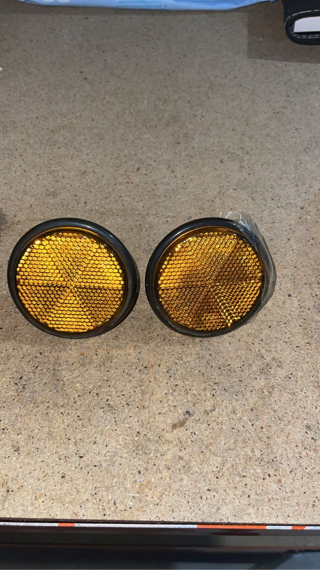 Detalles del productoPar de reflectores circulares de color ámbar para motocicleta. Son ideales para mejorar la visibilidad y seguridad.