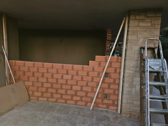 Ladrillos y otros materiales para proyectos de construcción o reforma. - Ladrillos de cerámica roja. - Elementos de madera para soporte. - Escalera de mano metálica.