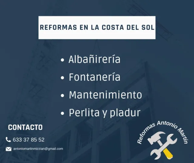 Detalles del productoEn Antonio Martín Reformas realizamos todo tipo de trabajos en el sector de las reformas, siendo la profesionalidad nuestra prioridad: Albañirería, Fontanería, Mantenimiento, Pintura...
