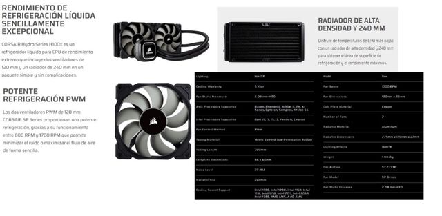 Detalles del productoSistema de refrigeración líquida para CPU de alto rendimiento. Incluye dos ventiladores de 120 mm y un radiador de 240 mm.