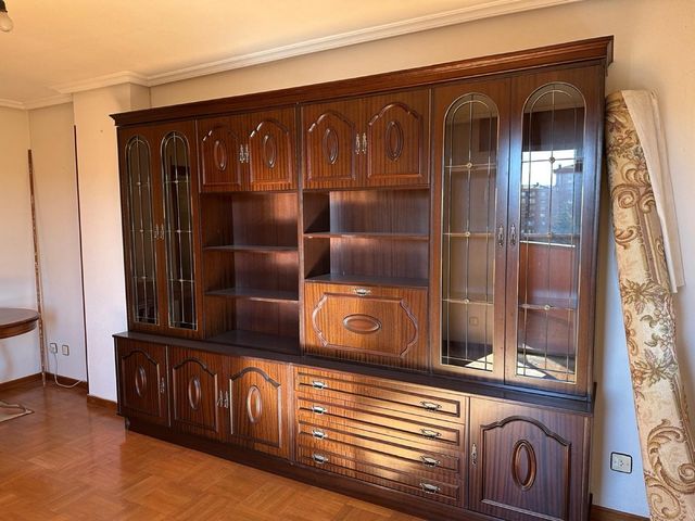 Detalles del productoideal para lacar en blanco, Conjunto de muebles prácticamente nuevos de madera oscura para salón. Incluye vitrinas, estanterías y cajones.