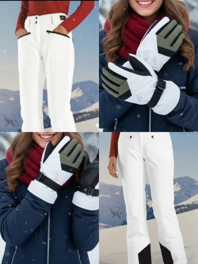 Conjunto de pantalón de nieve y guantes a juego, ambos con etiqueta. - Pantalón blanco con detalles en negro. - Guantes con diseño en blanco, verde y negro.