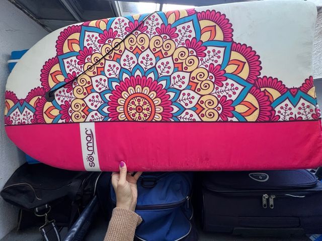 Tabla de surf con un diseño vibrante y colorido, ideal para iniciarse en el surf. - Diseño mandala. - Color base blanco y rosa. - Marca: Solmar.