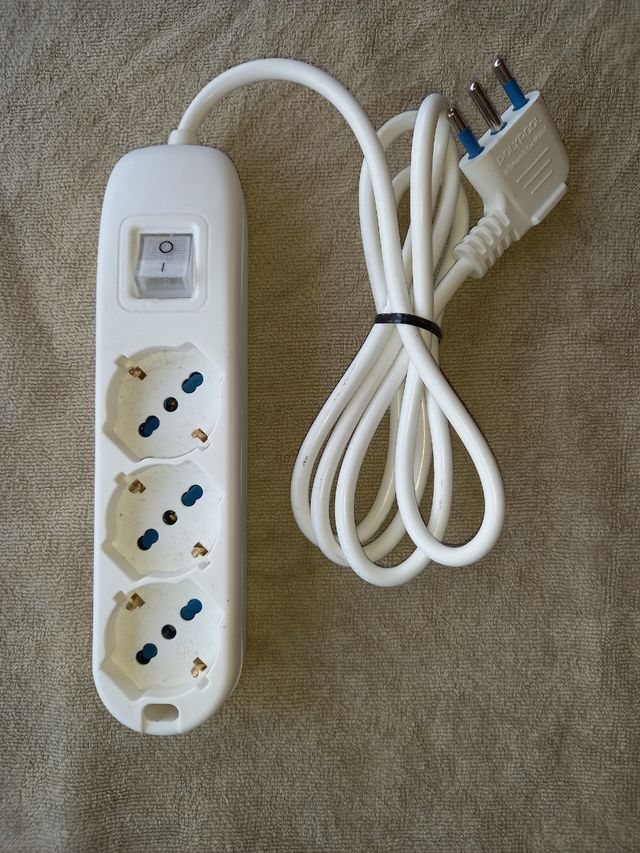 Detalles del productoRegleta de alimentación con tres tomas de corriente y un interruptor general para controlar el flujo de energía.