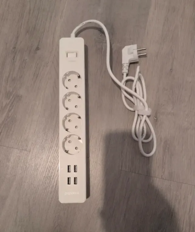 Regleta blanca con cinco enchufes y cuatro puertos USB. - Interruptor de encendido/apagado. - Diseño alargado y compacto. - Marca: papaloock.