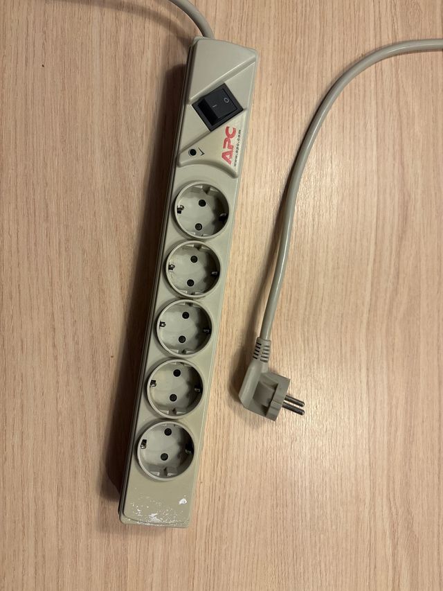 Detalles del productoRegleta / ladrón / alargador de alimentación APC con cinco enchufes y un interruptor principal. Longitud regleta 38 cm + longitud Cable 200 cm. Todas las tomas funcionan.