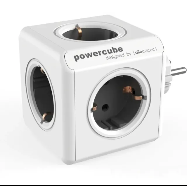 Regleta de enchufes en formato cubo, compacta y práctica. - Diseño cúbico. - Cinco enchufes. - Marca: Powercube by Allocacoc.