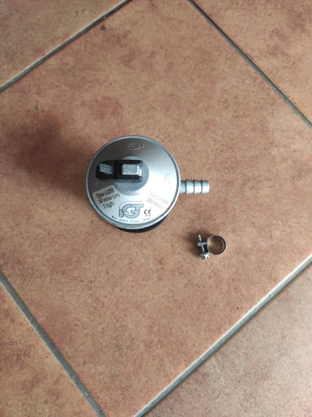 Regulador de gas para bombonas de butano. - Tipo A235. - Presión de salida: 30 mbar. - Caudal: 2 kg/h. - Presión máxima de entrada: 16 bar. - Incluye abrazadera.