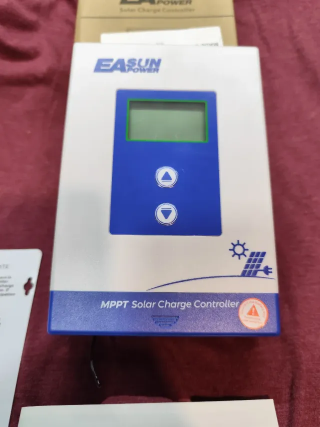 Regulador de carga solar MPPT de la marca Easun. - Tecnología MPPT para máxima eficiencia. - Pantalla LCD para visualización de datos. - Botones de navegación.