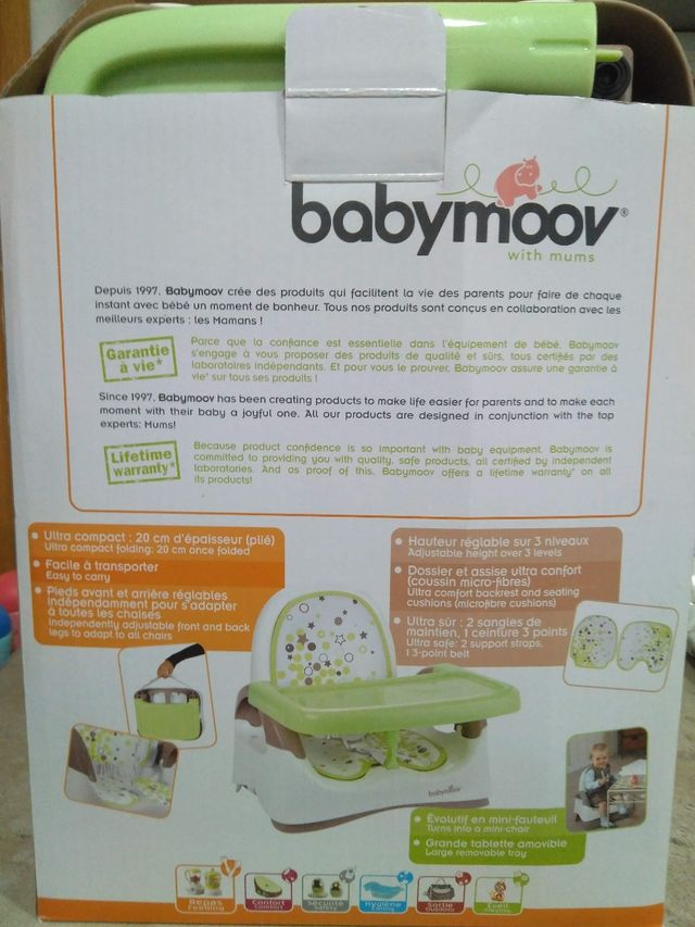 Rehausseur Compact BabyMoov, ideal para niños a partir de 1 año. Se pliega fácilmente para un transporte cómodo. Tiene altura regulable en 3 niveles y arnés de seguridad. Incluye bandeja extraíble. Está en muy buen estado, apenas se ha usado.