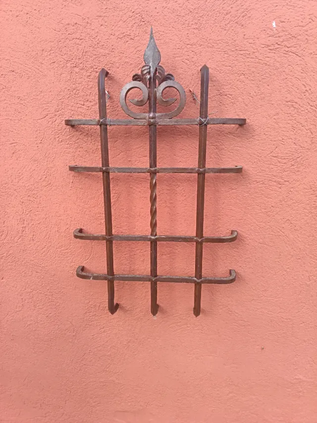 Detalles del productoReja de hierro forjado con más de 100 años de antigüedad, procedente de una ermita. Presenta un diseño clásico con detalles ornamentales.